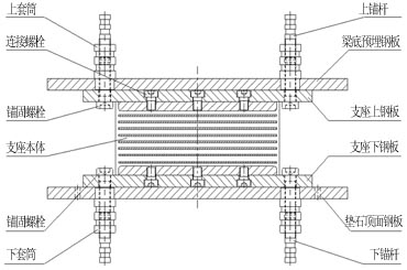 Ⅰ型——支座與墩、梁之間采用套筒連接,支座頂面、底面均設預埋鋼板,上、下支座板和套筒之間采用錨固螺栓連接,上、下預埋鋼板與套筒之間采用配合焊接。
