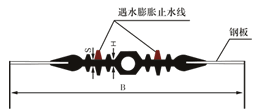 為了使止水帶各部分受力均勻、合理,我公司自行研制設(shè)計的遇水膨脹橡膠止水帶,起斷面采用了非等厚結(jié)構(gòu),分為強力區(qū)、防水區(qū)和安裝區(qū),同時伸縮孔外壁為平面,模板夾制時,接觸面大,防止脫位,在安裝區(qū)增設(shè)了安裝孔,可使其與相鄰錨固筋方便固定,不位移、易施工安裝。